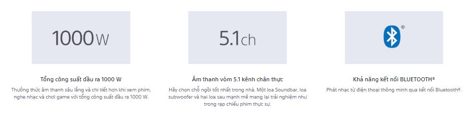 Trải nghiệm âm thanh như tại rạp chiếu phim ngay ở nhà nhờ hệ thống âm thanh 5.1 kênh với các loa sau nhỏ gọn có tổng công suất đầu ra 1000 W. Hãy đắm chìm trong khoảnh khắc lay động của âm thanh vòm chân thực.
