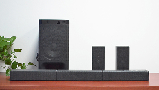 Cảm nhận âm thanh mạnh mẽ khi xem phim với loa sau đặt trên giá hoặc gắn trên tường một cách kín đáo, cộng với một loa Soundbar 3 kênh và loa subwoofer.