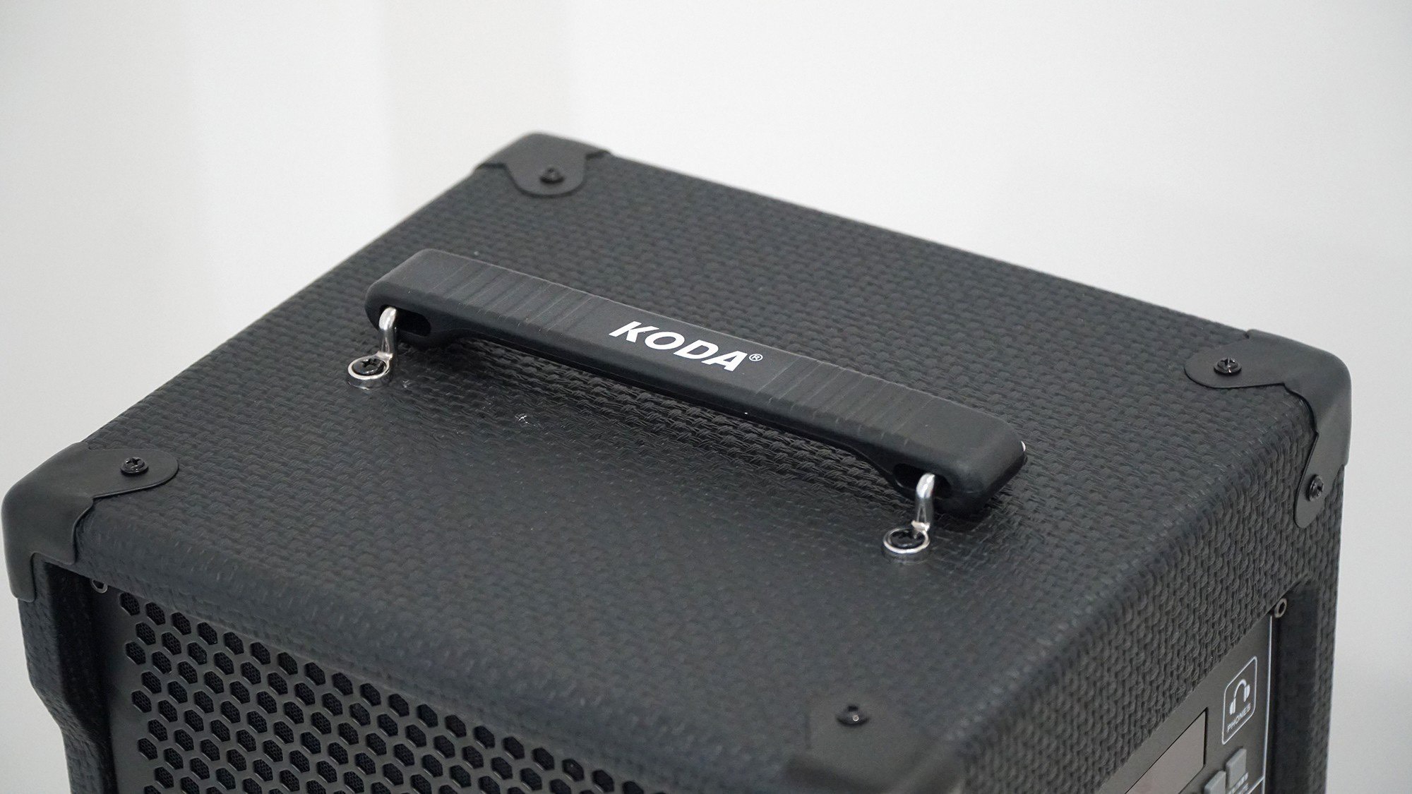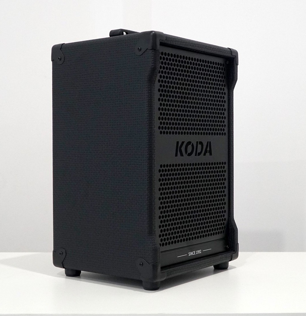 - Chất liệu vỏ loa: gỗ MDF, bọc da bện, tay cầm bằng da