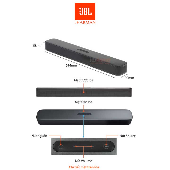 Các nút bấm chức năng trên loa cũng được gộp chung lại thành khu vực cao su liền mạch và có đèn nền, thay cho kiểu từng nút bấm rời như mẫu JBL Bar Studio, riêng hai nút bật/tắt nguồn và chuyển qua lại các chế độ kết nối được làm hơi lõm nhẹ để dễ phân biệt, nút bấm mềm cho cảm giác bấm thoải mái.